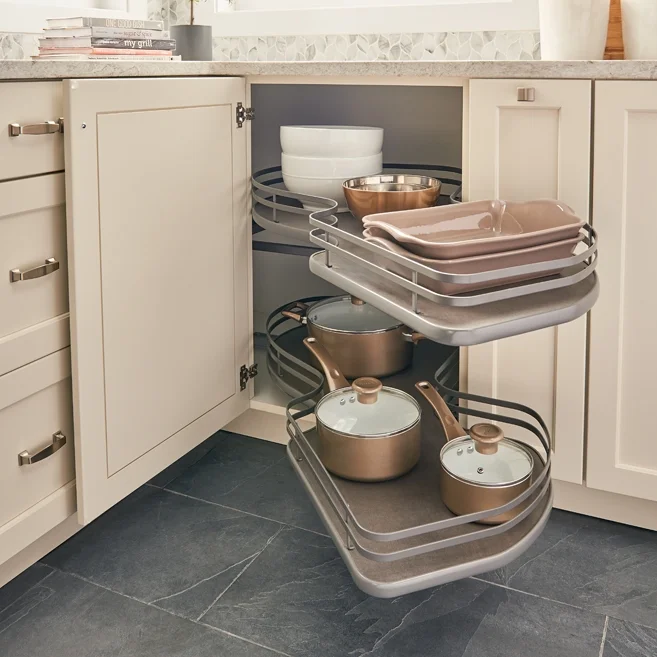 Installing a pullout organizer that maximizes as much space as possible with a shape designed specially for blind corner cabinets.