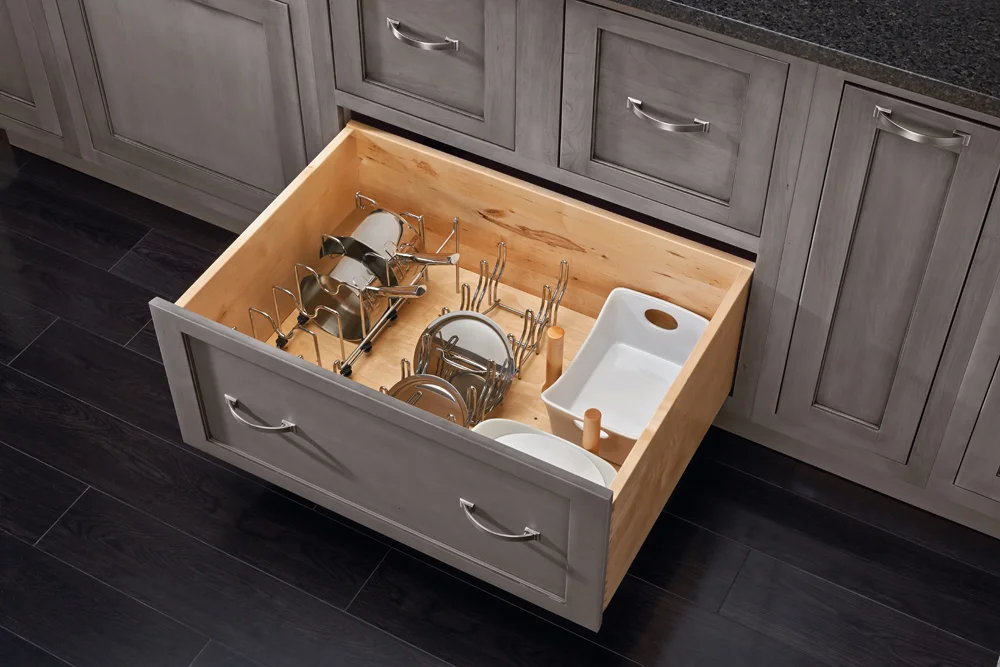 From fine china, to pots/pans, to daily kitchen ware, a pegboard system is where you never have to worry about the size of your sets anymore. Find a trim to fit solution and you could deck out every drawer you have with one!